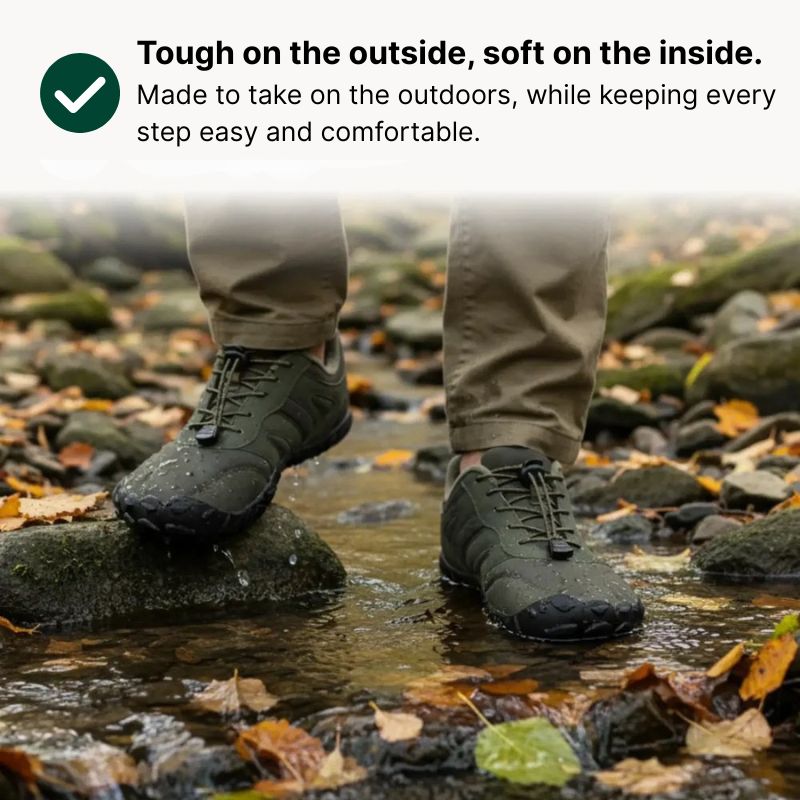Traditional rigid shoes lock your feet and strain your joints. Caspian restores your natural stride with a wide toe box, zero heel, and a thin, flexible sole so your feet can move freely, just like barefoot.